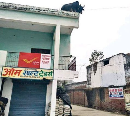 Um boi de meia tonelada subiu no telhado de um complexo comercial na Índia e deixou policiais mais ocupados do que gostariam. Policiais acreditam que o animal subiu um lance de escadas do prédio em reformas — que abriga uma agência local de impostos e correios — e não conseguiu mais descer. Informações do R7.