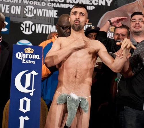 O boxeador Paulie Malignaggi posou para os fotógrafos em Washington, nos EUA, usando uma roupa de baixo curiosa, no formato de uma cabeça de elefante, durante a pesagem oficial da Federação Internacional de Boxe.