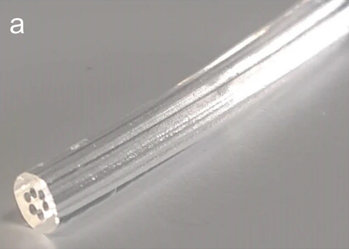 “Para produzir a fibra, vertemos ágar de tipo alimentício em um molde, com seis hastes longitudinais dispostas simetricamente em torno do eixo principal. A gelatina se distribuiu pelo espaço disponível. Após o resfriamento, as hastes são removidas para formar orifícios de ar e o guia de ondas solidificado é liberado do molde. O índice de refração e a geometria da fibra podem ser adaptados, variando a composição da solução de ágar e o design do molde, respectivamente”, explica Fujiwara.