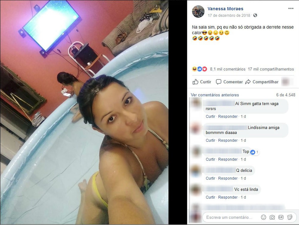 Vanessa ficou conhecida nas redes sociais ao compartilhar uma foto curtindo a piscina com a filha Heloísa Moraes, de 14 anos. A imagem postada no Facebook recebeu mais de 10 mil curtidas e foi compartilhada mais de 17 mil vezes até esta quarta-feira (23). "Recebo mensagem de gente até da Alemanha e da Arábia Saudita", diz.