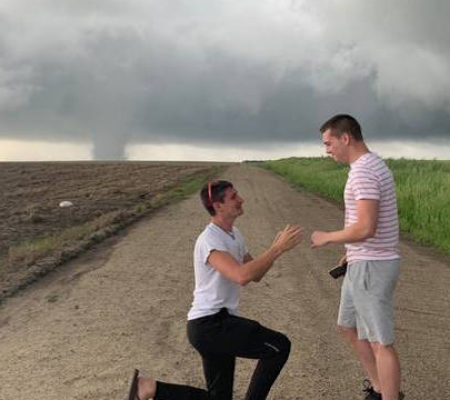 Uma foto registrando Joey Krastel, de 27 anos, ajoelhado diante de Chris Scott, de 23, mostrou ao fundo um tornado que vinha na direção deles, no Kansas (EUA). "Os dois amores da minha vida", escreveu Joey no Twitter.