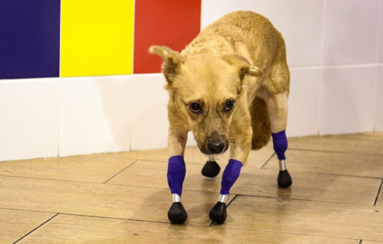 Só então elas chegaram à clínica em que a cadela foi operada. Em duas semanas de cirurgia, Monika já consegue ficar em pé e andar com as quatro patinhas de titânio.
