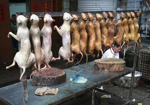 Considerado uma iguaria apreciada em alguns países asiáticos, cães assados foram vistos sendo vendidos em uma barraca em Yulin, na região autônoma Guangxi Zhuang, na China. A partir do dia 21 de junho, Yulin promove um festival anual de carne canina.