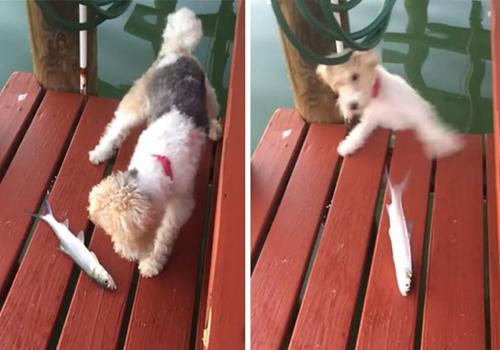 Após inspecionar bastante o animal, o fox terrier leva um susto quando o peixe se debate novamente e acaba caindo na água, deixando seus donos preocupados apesar da cena curiosa.