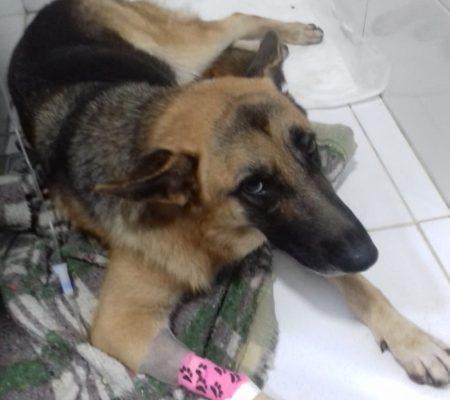 A pastora alemã Pandora estava com aproximadamente 50 dias de gestação quando sofreu um aborto - faltavam 10 dias para ela dar à luz a oito filhotes. A cadelinha está internada no CRV desde a última quarta-feira (19) e foi salva com a ajuda do cão Tyson, que doou 500 ml de sangue.