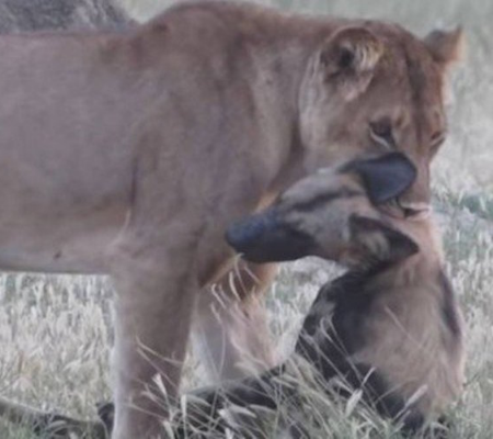 Cão selvagem se finge de morto para escapar de leoa; vídeo