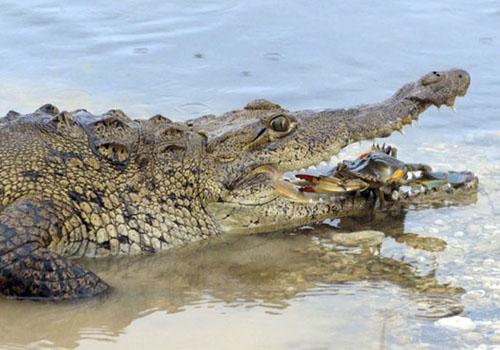 Um caranguejo parecia descansar na mandíbula de um aligátor (jacaré americano) ao ser fotografado antes de virar comida do réptil no estado da Flórida, nos EUA.