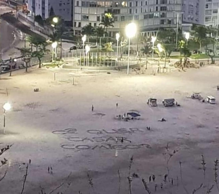 A sensação de estar no alto de um mirante, olhar para baixo e ver a frase 'Cê quer casar comigo?' escrita na areia da praia de São Vicente, no litoral de São Paulo, foi descrita como "sensacional" pela jovem Larissa de Oliveira, de 23 anos, que foi pedida em casamento pelo então namorado, e agora noivo, Roger Pereira, de 24. As informações são do G1.