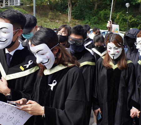Os universitários entoavam palavras de ordem como "Façam a revolução, libertem Hong Kong!" e "Uma saída, Hong Kong independente!", entre vários outros slogans, como parte de uma cerimônia de formatura improvisada.