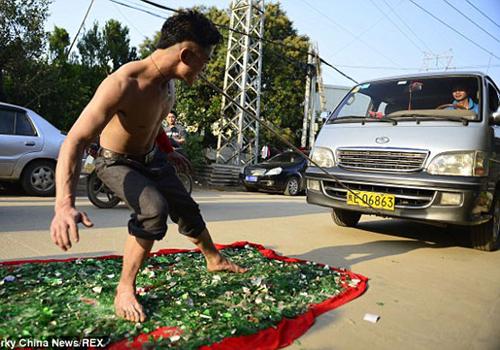 Ele começou a praticar a façanha há 10 anos atrás, e agora consegue puxar uma van pesando três toneladas pelas ruas. Mas, para dificultar ainda mais sua façanha, Dong coloca pedaços de garrafas quebradas para pisar.