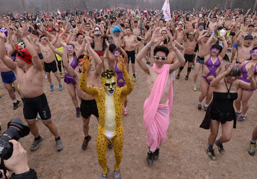 Cerca de 200 participantes ficaram apenas com roupa de baixo ou fantasias durante a corrida anual ?Undie Run?, realizada no Olympic Forest Park em Pequim, na China.