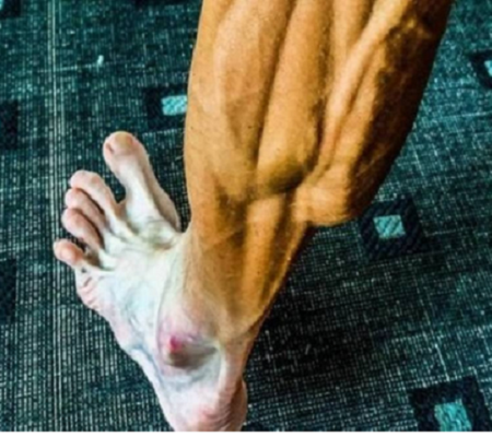Na foto da perna esquerda do ciclista, bastante desidratada, é possível ver todos os músculos, sem gordura subcutânea.