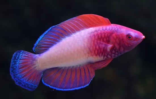 Nas águas azuis e quase transparentes da região das Maldivas vive uma espécie de peixe recém-descoberta: trata-se do lindíssimo Cirrilabrus finifenmaa, cujo nome comum pode ser traduzido como bodião-de-fada-de-rosa. Ele tem essas cores de arco-íris e vive em profundidades que variam de 40 a 70 m.