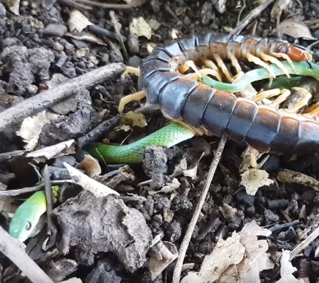 Um registro impressionante mostra o momento que uma lacraia, também conhecida em algumas partes do Brasil como piolho-de-cobra, agarra e mata uma inocente cobra verde. O registro aconteceu na Serra Talhada.