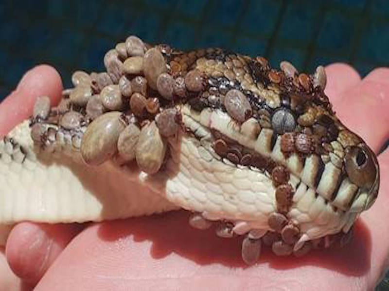 A cobra que foi resgatada após tentar afogar 511 carrapatos na piscina de uma casa em Coolangatta (Gold Coast, Austrália), no início de janeiro, voltou finalmente à vida selvagem na semana passada. Nike, como a píton passou a ser chamada, foi levada para tratamento em uma clínica de animais silvestres. Veterinários removeram todos os carrapatos e a serpente ficou em quarentena.