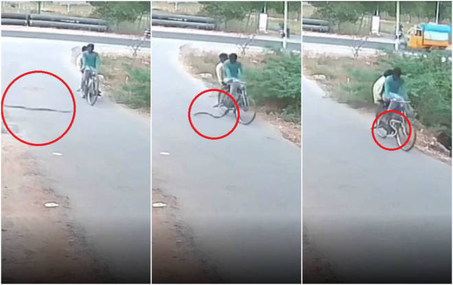 Dois ciclistas da cidade de Telangana, no sul da Índia, passaram por momentos de terror: uma cobra venenosa, identificada como uma naja, se enroscou na roda da bicicleta que compartilhada pelos rapazes, fazendo a dupla abandonar o veículo na rua e correr pelas próprias vidas.