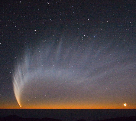 Quando se aproximam da órbita de Júpiter, o calor do Sol faz evaporar os materiais mais voláteis que compõe o cometa, formando uma tênue atmosfera em torno do núcleo chamada de coma. Os ventos solares, ao atingirem o cometa, arrastam parte da coma na direção oposta ao Sol, formando uma enorme cauda. Tanto a coma quanto a cauda de um cometa brilham devido à ionização de seus gases pelo Sol.