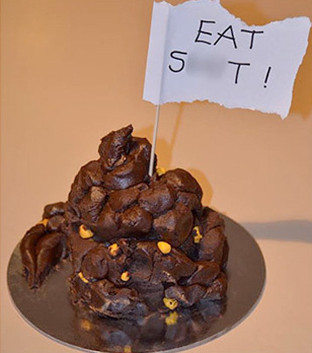 A dona de uma confeitaria na Nova Zelândia se desentendeu com uma cliente e ?se vingou? ao fazer um bolo em formato de fezes, e espetar uma placa com os dizeres ?coma m??.