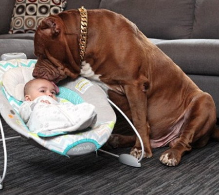 É comum que as pessoas tenham preconceito com cães da raça pitbull , já que associam eles a um comportamento violento e hostil. Contrariando essa ideia, o maior pitbull do mundo, o Hulk , é uma babá perfeita e dá sempre muita atenção, amor e carinho aos novos bebês de sua família.