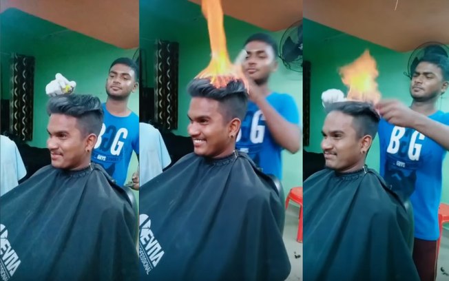 A gravação mostra o momento em que um barbeiro da cidade de Chennai, no sul da Índia incendeia o cabelo de seu cliente, e começa a pentear o corte masculino com o auxílio de duas escovas até as chamas se extinguirem. De acordo com o New York Post , o serviço pode custar entre US$ 26 e US$ 52 (cerca de R$100 e R$200, respectivamente).