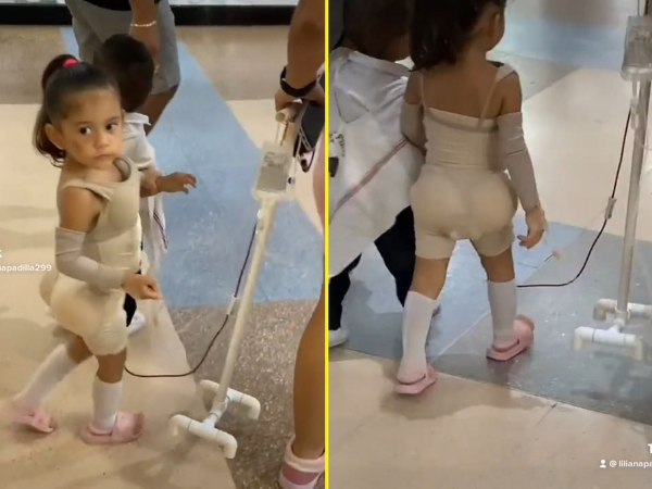 A garotinha estava simulando uma paciente que teria acabado de sair da sala de cirurgia, carregando inclusive um suporte com soro fisiológico, além da meia de compressão branca. O que chamou a atenção da tiktoker é que o look bizarro da criança simula uma mulher que teria realizado procedimento de aumento de seio e bumbum.