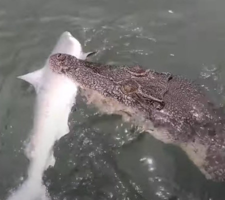 Um pescador passou por uma situação inusitada. Após fisgar um tubarão de pequeno porte a 80km da costa de Wyndham, cidade localizada na Austrália Ocidental, ele teve que batalhar por seu prêmio com um imenso crocodilo de água salgada. As informações são do IG.