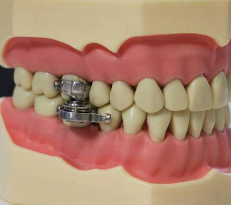 O DentalSlim Diet Control é preso nos dentes com parafusos feitos sob medida e usa imãs poderosos para impedir que a mandíbula seja aberta.