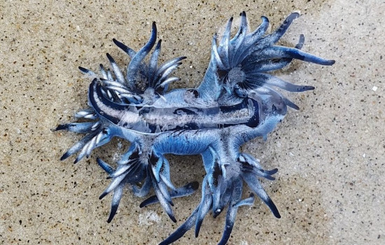 Um molusco azul e bem pequeno, conhecido como dragão azul (Glaucus atlanticus), foi flagrado em uma praia de Bertioga, no litoral de São Paulo, e chamou a atenção de uma moradora. Em imagens divulgadas nas redes sociais, o animal aparece encalhado em uma faixa de areia da praia de Riviera de São Lourenço. O animal não é venenoso, mas pode soltar uma toxina que pode queimar a pele de quem tocá-lo.