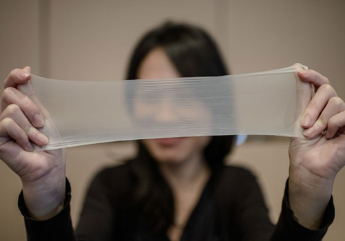 Em uma exposição feita pela empresa nesta quinta-feira (20) em Hong Kong, uma funcionária demonstrou a elasticidade do látex, que apesar de ser muito fino é bastante resistente.