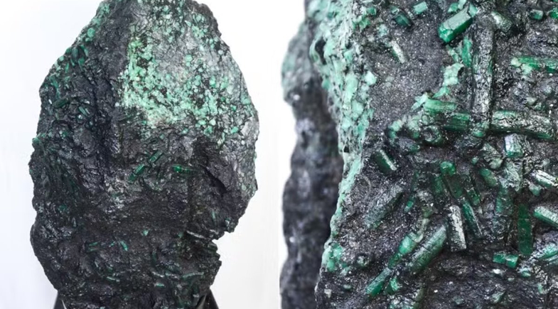A peça impressiona com seus 92,5 kg, 68 cm de altura e cristais hexagonais de berilo bem preservados, com intensa coloração verde-esmeralda.