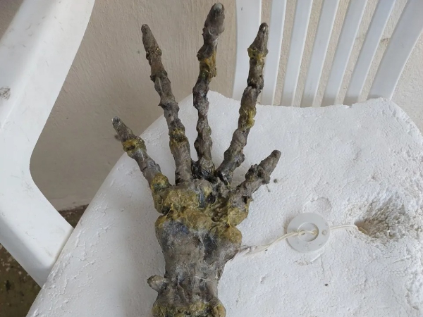 O esqueleto foi encontrado por Letícia e Devanir enquanto eles caminhavam pela faixa de areia do Balneário Mares do Pontal, na manhã deste domingo (20). “Cedinho eu e meu namorado andando pela praia encontramos essa 'espécie de mão'. Não achamos que pode ser humana por conta do tamanho e quantidade de falanges. Estamos impressionados”, escreveu a moça, nas redes sociais.