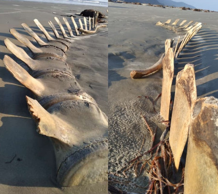 O biólogo marinho Douglas Rey dos Santos analisou as imagens do esqueleto e afirmou tratar-se, sem dúvidas, de uma baleia. "Apesar de parte da coluna estar enterrada, dá para perceber que são vértebras bem espessas do pedúnculo caudal de uma baleia", explica.