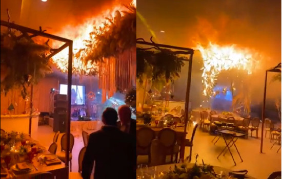 O fogo começou no teto do salão após os fogos de artifício próximos ao palco estourarem. Rapidamente as chamas se alastraram enquanto convidados e funcionários do espaço são vistos deixando o lugar.