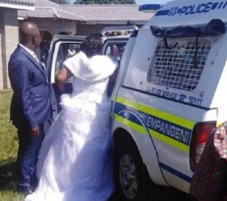 A polícia local chegou após receber uma denúncia anônima. "Um casal foi preso no dia do casamento em Nseleni, por violar as regras de bloqueio, já que decidiu não adiar o 'grande dia'", escreveu o jornalista africano Mzilikazi wa Afrika em seu Twitter, com um vídeo do casal recebendo no carro da polícia.