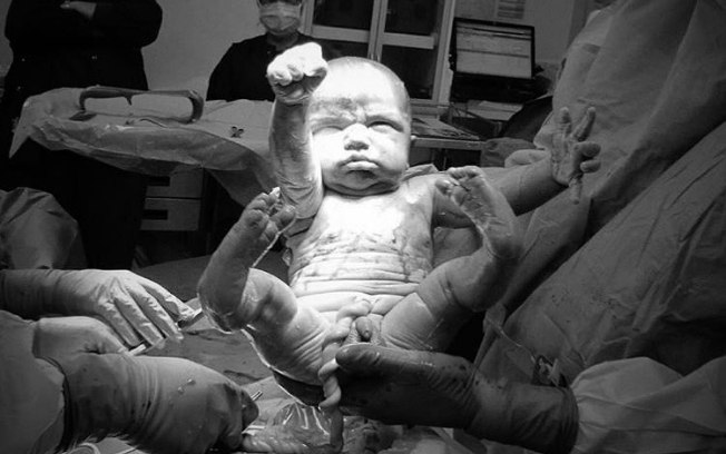 O pai do pequeno Harry, da Austrália, capturou o momento exato e fez uma foto de parto em que ele aparece com a mãozinha para cima, com o punho fechado. A imagem foi compartilhada na conta do Instagram “Hello World Birth ” com uma mensagem da mãe, Bree Jessica: “A chegada do super-homem”.