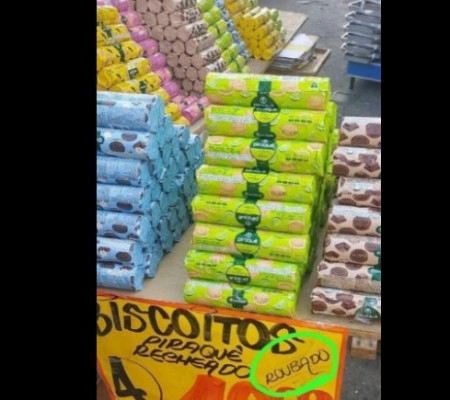 Um usuário compartilhou uma imagem de uma banca de ambulante vendendo biscoito. Tudo muito bem se não fosse a promoção um tano inusitada. Um pequeno detalhe no cartaz do camelô chamou a atenção de muita gente. O biscoito estava barato,mas tinha uma razão. Ele era roubado.