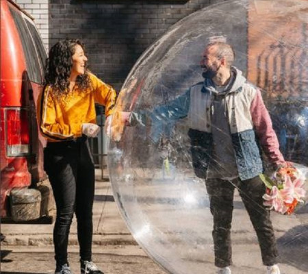 Isolado em quarentena, Jeremy foi correspondido. Ele e a vizinha, Tori, começaram um relacionamento virtual. Até que o fotógrafo quis dar um passo adiante: foi ao encontro dela. Para isso, o nova-iorquino se meteu numa bolha gigante. Levando até flores, bem romântico.