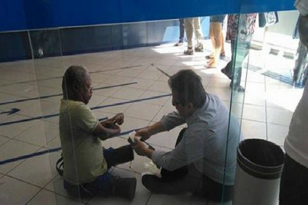 Para evitar que ele tivesse que pegar filas, Luis Claudio tomou uma atitude: se sentou no chão para poder dar um melhor atendimento ao senhor que ali estava. "Nem sabia que ele era gerente quando fotografei. Achei lindo o gesto, me emocionei, ele (o gerente) foi muito gente boa, todo arrumado sentou no chão, fazendo seu trabalho com muita alegria", contou Isabel ao portal Razões para Acreditar.