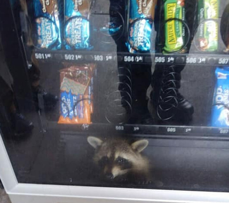 Um guaxinim "ladrão" ficou preso em uma máquina de venda de lanches no estado americano da Flórida. O caso ocorreu no condado de Volusia na quarta-feira (14). A polícia postou fotos do "assaltante" pego em flagrante.