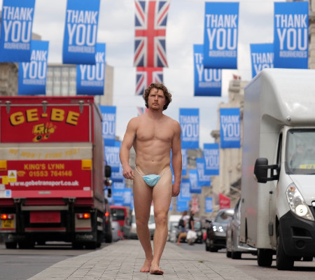 Um homem foi flagrado nesta sexta-feira (24) caminhando nu pela Oxford Street, tradicional rua de lojas em Londres, capital do Reino Unido. Ele usava apenas uma máscara nas partes íntimas, mas o rosto continuava descoberto. As informações são do G1.