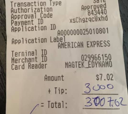 Ring decidiu não divulgar o nome do cliente porque acredita que o homem não gostaria disso. Porém, o dono contou que o valor da cerveja — o único item consumido pelo doador no restaurante — somado aos impostos era de US$ 7,02. Isso não representa nem 1% do total da gorjeta.