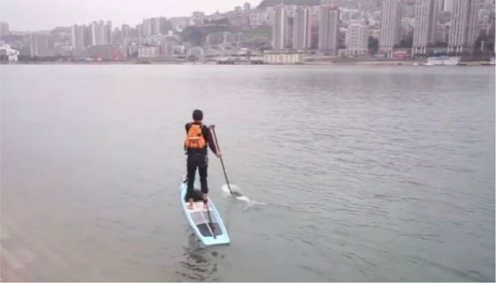Foi então que ele teve uma ideia inusitada: passou a cruzar o rio em uma prancha de stand up paddle. Com isso, ele diminui o tempo de viagem para cerca de 6 minutos! Muito melhor, hein? Fucao competiu durante 2 anos em torneios de paddle boarding, algo que facilitou bastante na hora de colocar a ideia em prática. O agente de seguros coloca todo seu equipamento em uma bolsa impermeável e cruza os cerca de mil metros que separam as margens do rio com a maior facilidade.