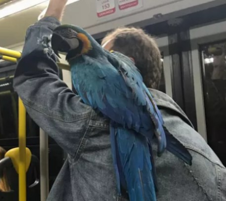 Uma passageira registrou na noite de quinta-feira (12) uma cena curiosa. Um passageiro entrou em um ônibus coletivo de Curitiba (PR) com uma arara canindé no ombro.