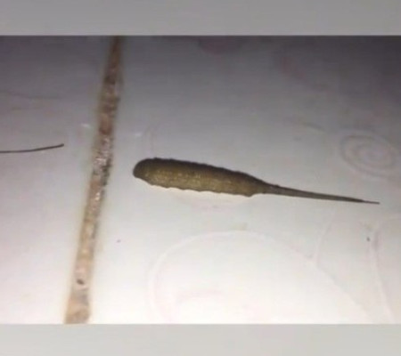 Mas a web resolveu a questão! Segundo alguns que assistiram o vídeo, se trata de uma lagarta de moscas-das-flores.Segundo um dos comentários, a tal cauda, é uma forma do corpo se locomover mais fácil em ambientes aquáticos.