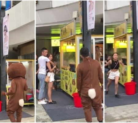 Com base na legenda do post, o cara que usava a fantasia de urso estava em um relacionamento de longa distância com a garota, e ele decidiu surpreendê-la. Ele supostamente viajou mais de 2.400km para fazer uma surpresa para a garota, mas ele foi o que teve uma surpresa desagradável.
