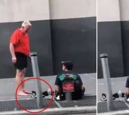 Um homem que fazia uma corrida no domingo (18/8) pela região próxima ao World Trade Center (WTC), em Nova York (EUA), parou diante de um mendigo que estava sentado em calçada e lhe entregou o par de tênis e as meias que usava. E seguiu andando descalço. As informações são do Extra.