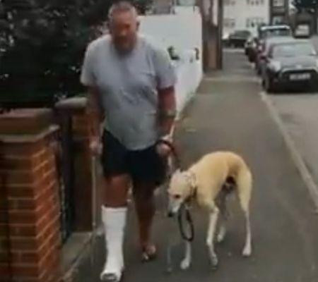 Russell Jones, dono do pet, publicou um vídeo em suas redes sociais onde aparece caminhando na rua de muletas e o cachorro Bill, ao seu lado, está mancando.