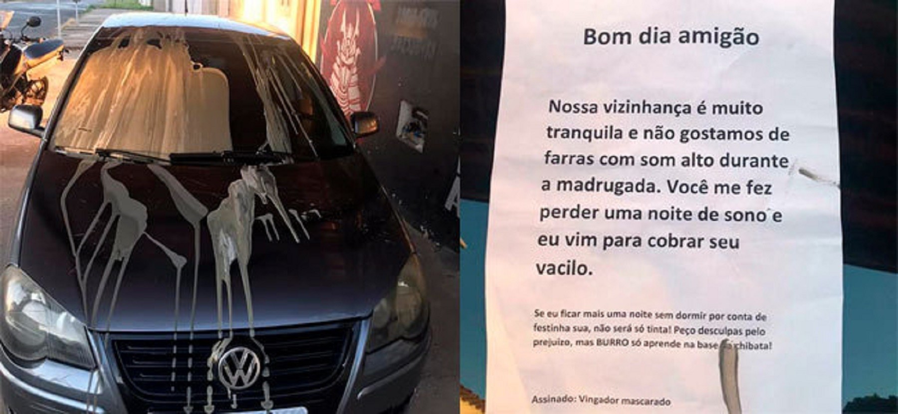 “Se eu ficar mais uma noite sem dormir por conta de sua festinha, não será só tinta. Peço desculpa pelo prejuízo”, escreveu o pichador no bilhete deixado no veículo.