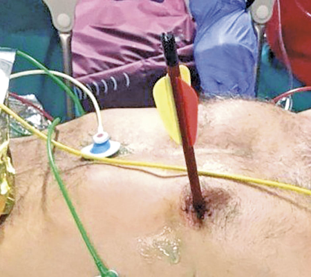 Um homem de 47 anos, morador de Aosta (Itália), está sendo considerado como agraciado por um "milagre". Ele sobreviveu após ser flechado "acidentalmente" no coração e num dos pulmões. A flecha de 30,5 centímetros de comprimento, disparada por besta, entrou no meio do mamilo esquerdo, atingindo o ventrículo esquerdo e parte do pulmão esquerdo. De acordo com reportagem do "Daily Mirror", os médicos que atenderam o paciente disseram não entender como ele não tivera "morte imediata" ao ser flechado. Pelo contrário, o homem esteve consciente todo o tempo até ser submetido a delicada cirurgia. O caso foi considerado raríssimo. A cirurgia sem precedentes, realizada na terça-feira (21/5), foi um sucesso.