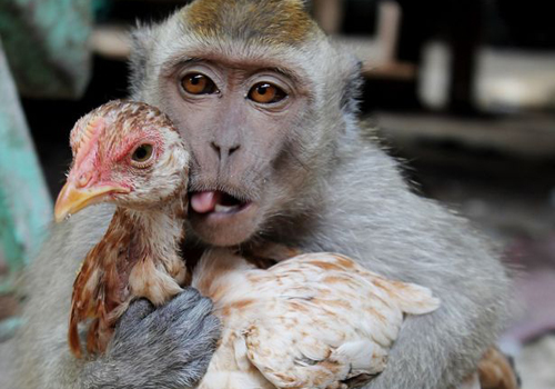 Um macaco, que reside com o dono no vilarejo de Banyuwangi, ilha de Java, na Indonésia, ficou supostamente apaixonado por uma galinha.